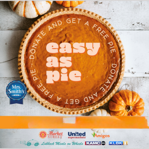 With Thanksgiving right around the corner, it’s time to start thinking seriously about PIE!  We have the perfect way for you to kick off the pie season.  This year, Lubbock Meals on WheelsUnited Supermarkets, KAMC, KLBK, and Mrs. Smith’s are teaming up to celebrate our 34th Annual Easy As Pie fundraiser.Visit your local, Lubbock Amigos, Market Street, and United Supermarket from  November 12 – November 26 and donate $5.00 to receive a coupon for a free Mrs. Smith’s pie..